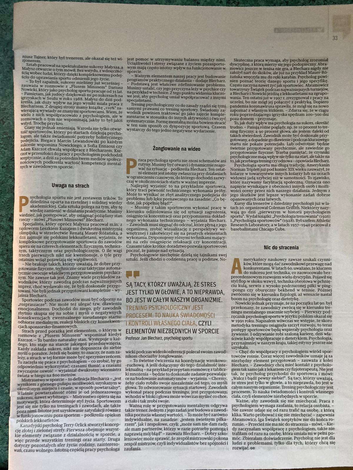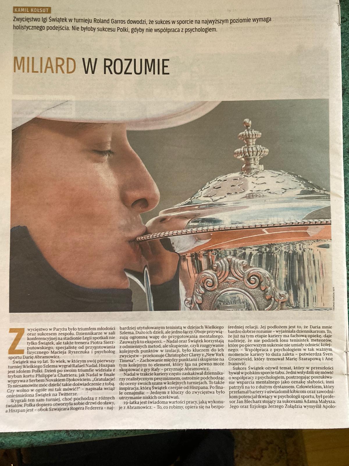 Niedawny triumf Igi Świątek w turnieju Rolanda Garrosa, to od kilku miesięcy temat gorący. Niektóre tajniki treningu mentalnego, bez którego we współczesnym sporcie trudno myśleć o wynikach na światowym poziomie, zdradza Profesor Jan Blecharz, w wywiadzie zamieszczonym w prestiżowym, weekendowym dodatku do „Rzeczpospolitej” – „Plus minus”.