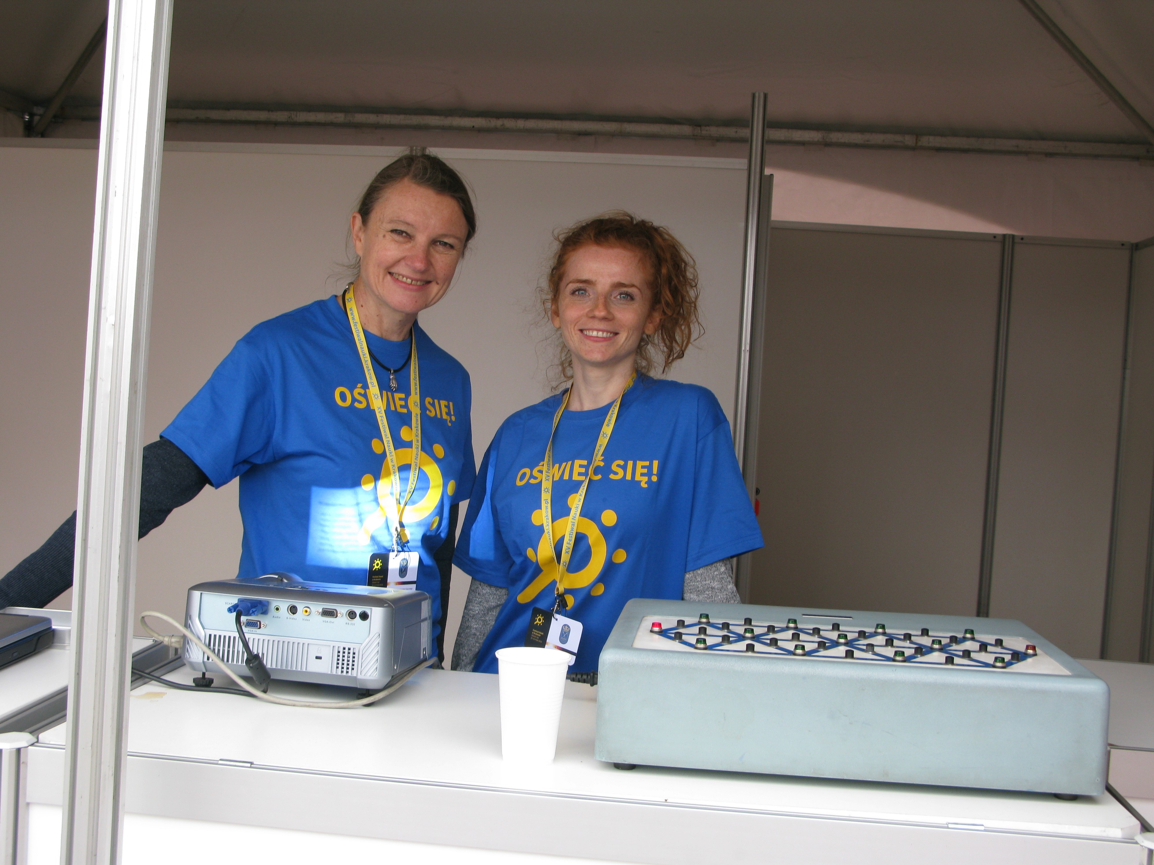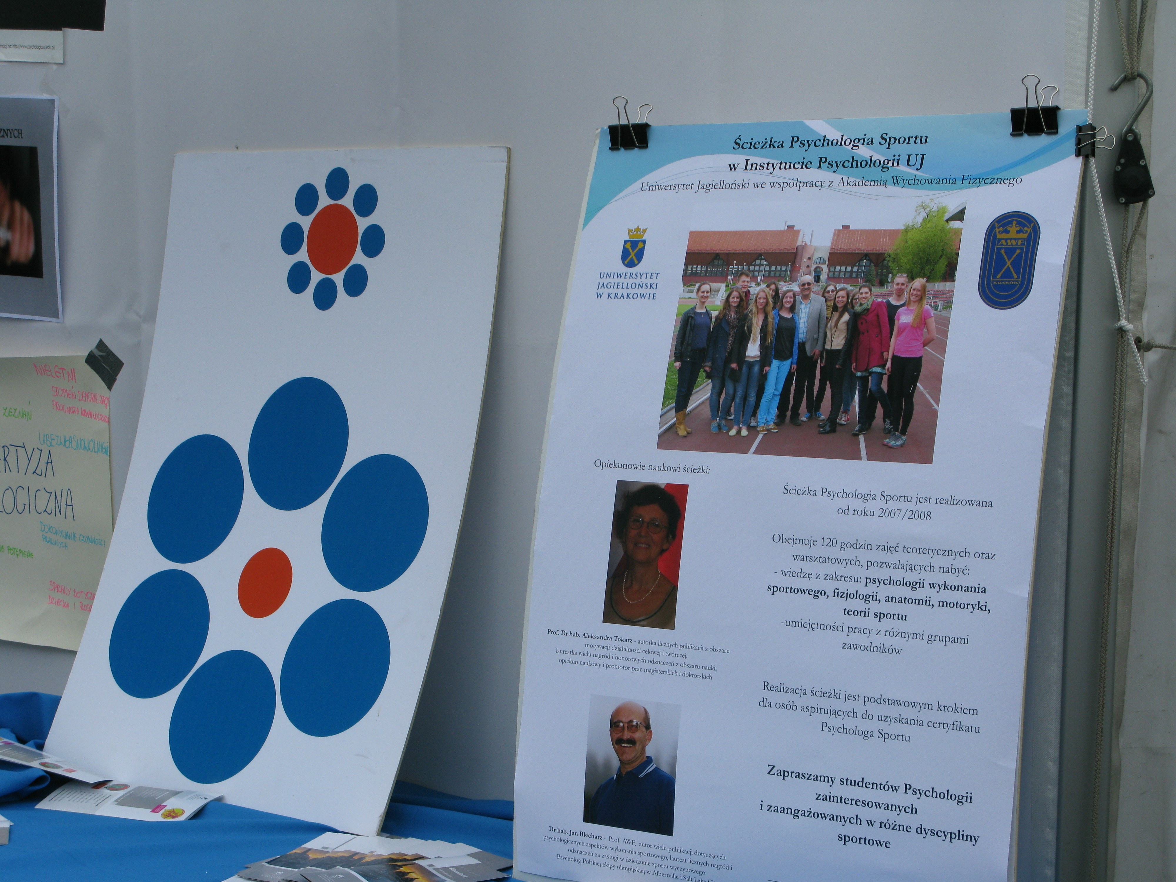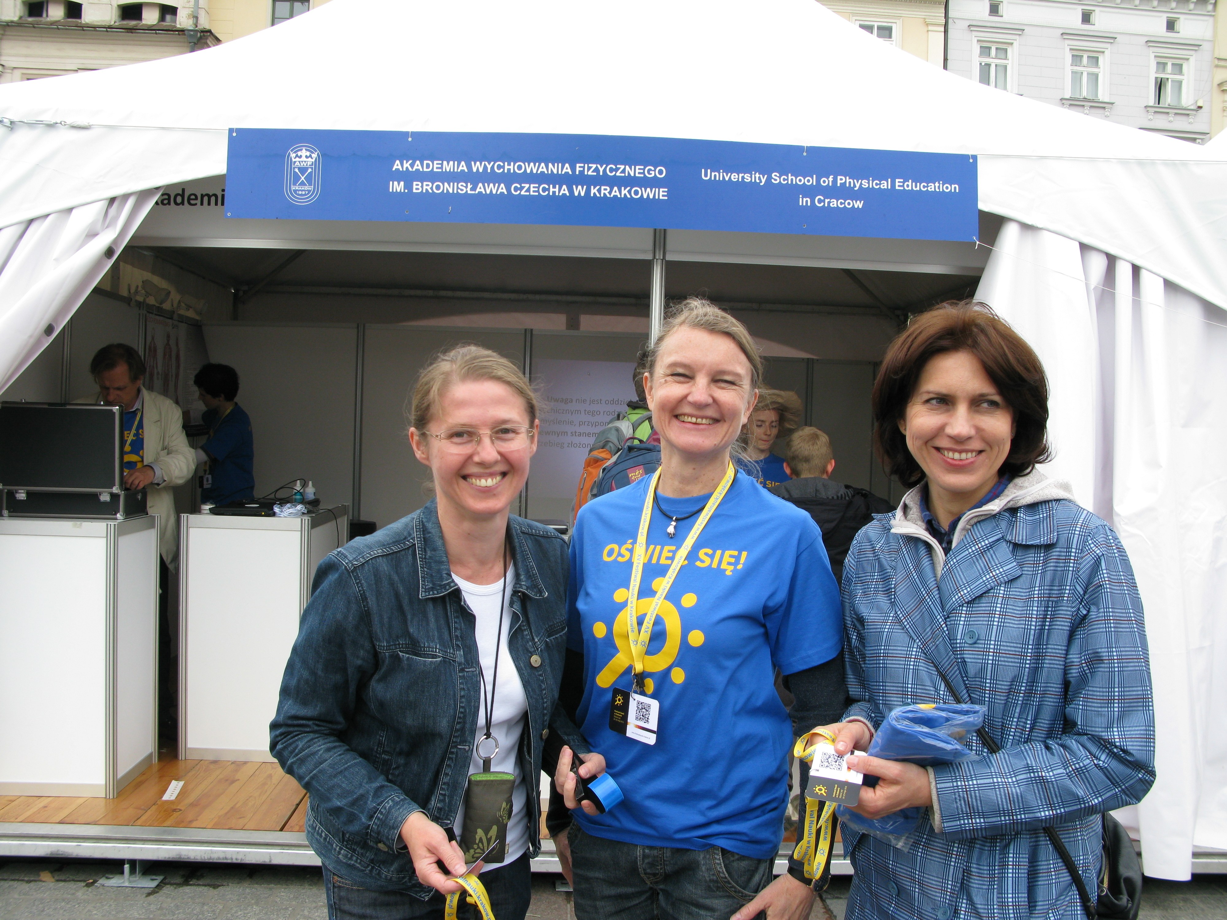 Od kilku lat Zakład Psychologii aktywnie uczestniczy w festiwalu w ramach ekspozycji AWF Kraków, prezentując obszary swoich badań, a także popularyzując wiedzę psychologiczną. Tegoroczny festiwal odbywał się pod hasłem „Oświeć się”, dlatego też prezentacja Zakładu ukazywała rolę światła w procesach poznawczych człowieka – szczególnie w odniesieniu do percepcji wzrokowej. Przedmiotem prezentacji była także uwaga, ponieważ jest procesem towarzyszącym wszystkim procesom poznawczym, zatem można ją określać mianem „promienia prowadzącego” percepcję człowieka. Także specyficznie ludzka zdolność do autorefleksj, dokonywania wglądu w samego siebie, może być rozumiana jako rodzaj „snopu światła” padającego na życie człowieka i wydobywającego z niepamięci ,czy nieświadomości, różne treści mające znaczenie dla jego funkcjonowania. Ekspozycja składająca się z: aparatów mierzących wybrane sprawności percepcji wzrokowej, programu biofeedback umożliwiającego dokonanie wglądu w stan emocjonalny oraz wyświetlanej – przez cały czas trwania ekspozycji – prezentacji Power Point z ciekawymi informacjami dotyczącymi percepcji wzrokowej, funkcjonowania uwagi oraz świadomości człowieka, była czynna od godziny 11.00 do 17.30 i przez cały czas przyciągała wielu zainteresowanych zarówno informacjami jak i możliwością sprawdzenia swojej percepcji. Ciekawość odwiedzających namiot naszej uczelni zaspokajały uśmiechnięte i wytrwałe: mgr Marzanna Herzig, mgr Aneta Cichosz i mgr Dominika Zapotoczna. Została także zaprezentowana współpraca Zakładu Psychologii AWF w Krakowie z Uniwersytetem Jagiellońskim na stanowisku „Ścieżka Psychologia Sportu”. Namiot i stanowisko ścieżki odwiedzili dr hab. Małgorzata Siekańska i dr hab. Jan Blecharz prof. nadzw., który jest autorem zdjęć z festiwalu.